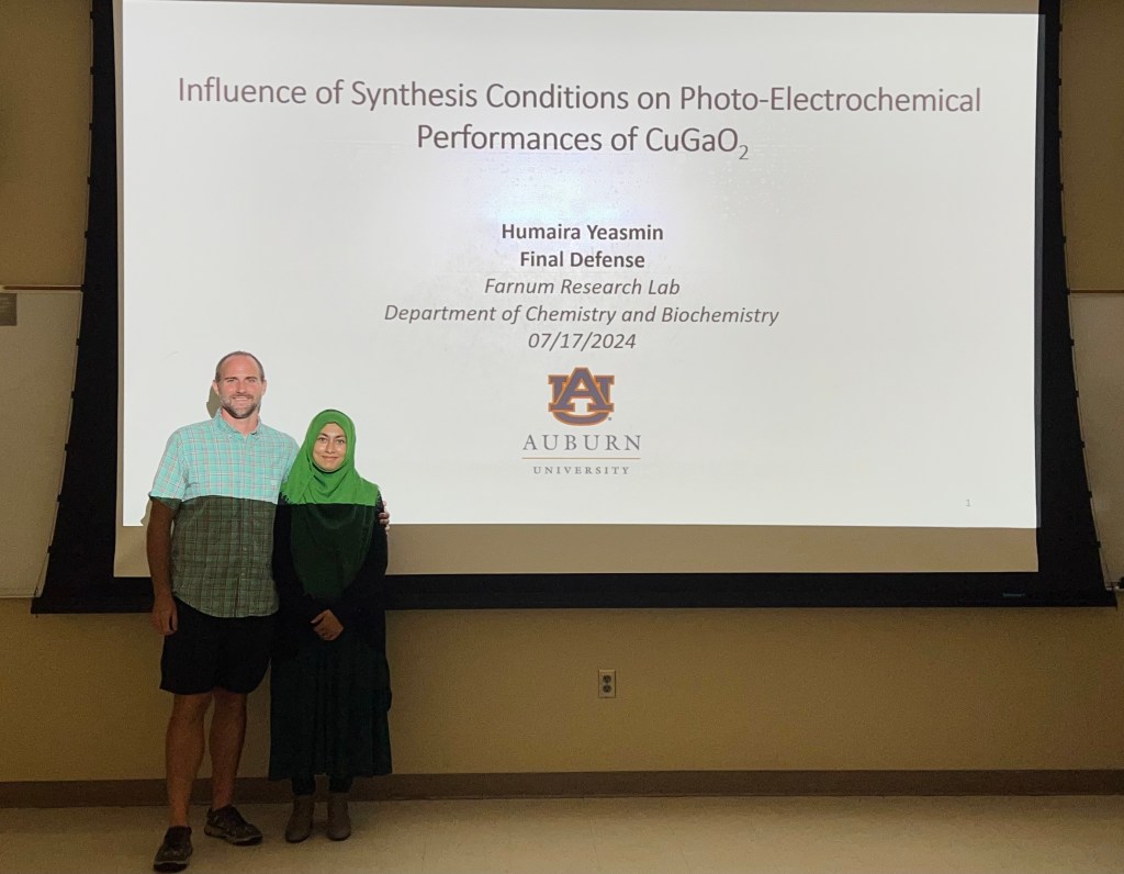 Humaira Yeasmin successfully defended her thesis to obtain her Ph.D. This is the fifth PhD from the Farnum group. We couldn’t be more proud of her research accomplishments in the area of p-type CuGaO2.