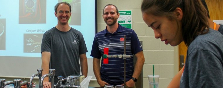 Another great week of teaching solar energy conversion and storage to high school students at Auburn’s Summer Science Institute. Students tested the photovoltaic properties of amorphous silicon solar cells and then built Cu/Zn batteries to store their solar energy. Batteries were then discharged to power an LED. This year, we got the disco ball to light up through multiple batteries! Check out the video below.
